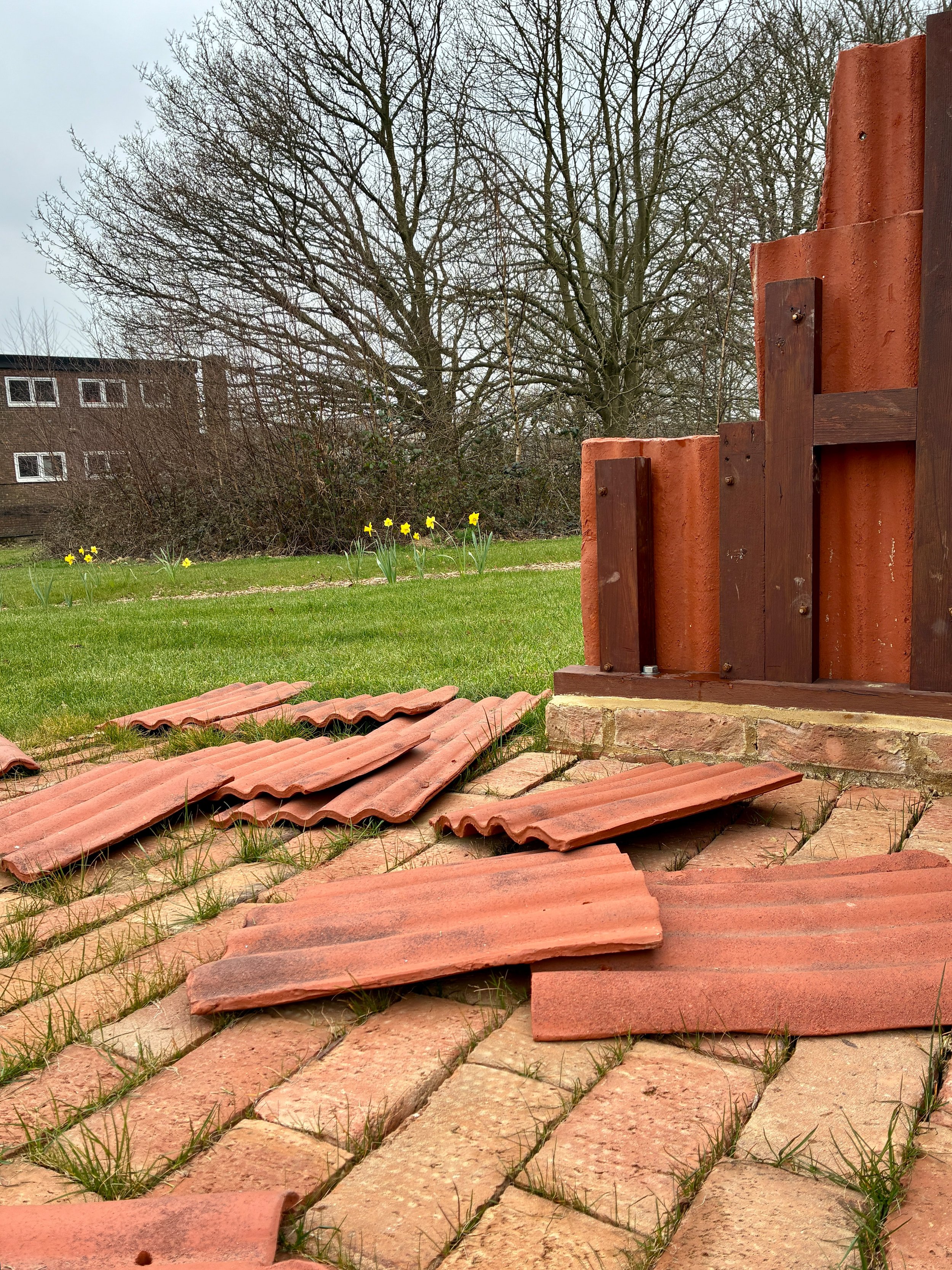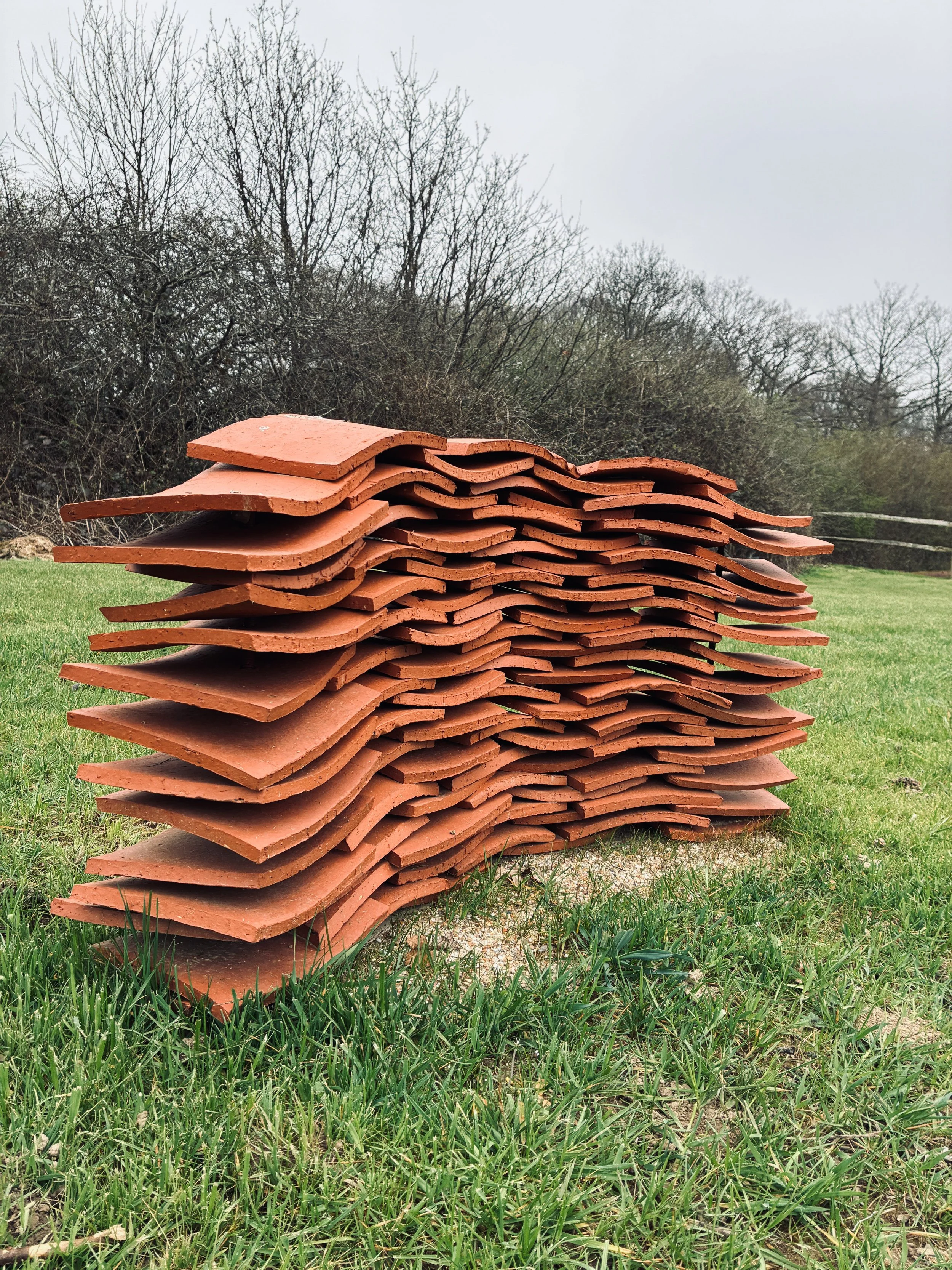 The piece consists of crafted panels of corrugated clay, recreating an old collapsed shed, the horizontal panels are essential components of the sculptural habitat and in combination with natural elements such as sunlight and soil they serve as a warm shelter for the slow worm.